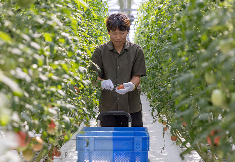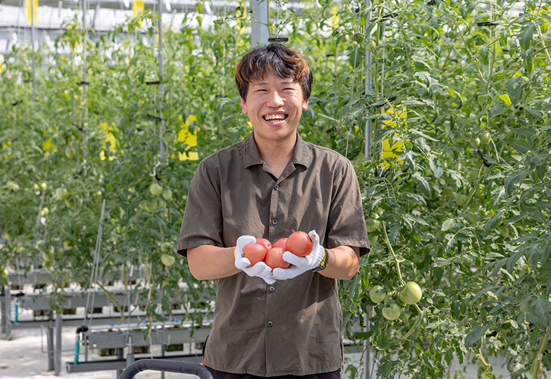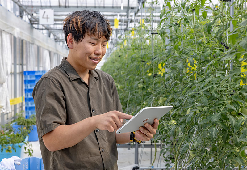 私が行っている「トマト独立ポット耕栽培」は、ハウス内でトマトの株を独立したポットに植え、自動制御で養液を供給して栽培します。栽培をコントロールしやすい点が強みなので、手をかけた分、しっかりと結果が出ます。トマトの生育状況は毎年少しずつ違うため、常にデータを見ながら、天候や生育に合わせてハウス内温度や肥料の量などを調整しています。自分でよりよい方法を考えて量も質も高めていくことが、やりがいにもつながっています。