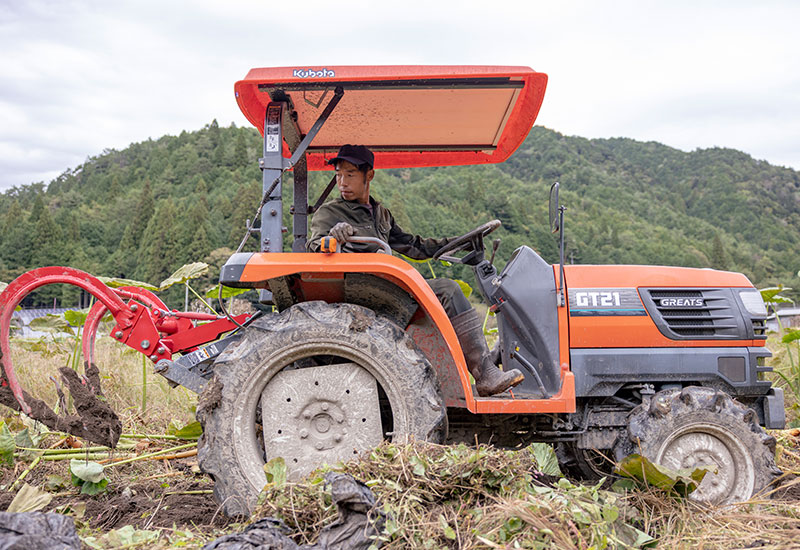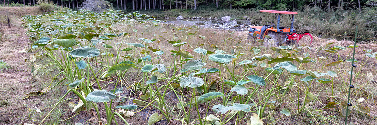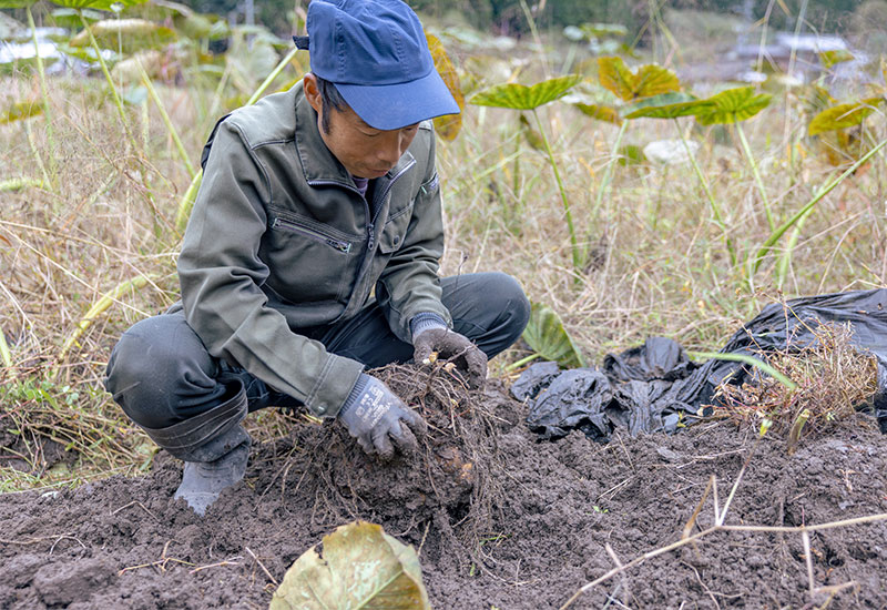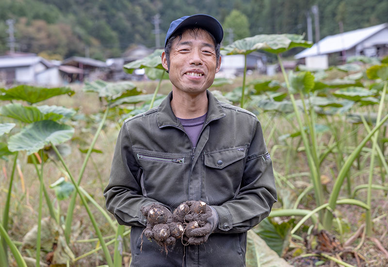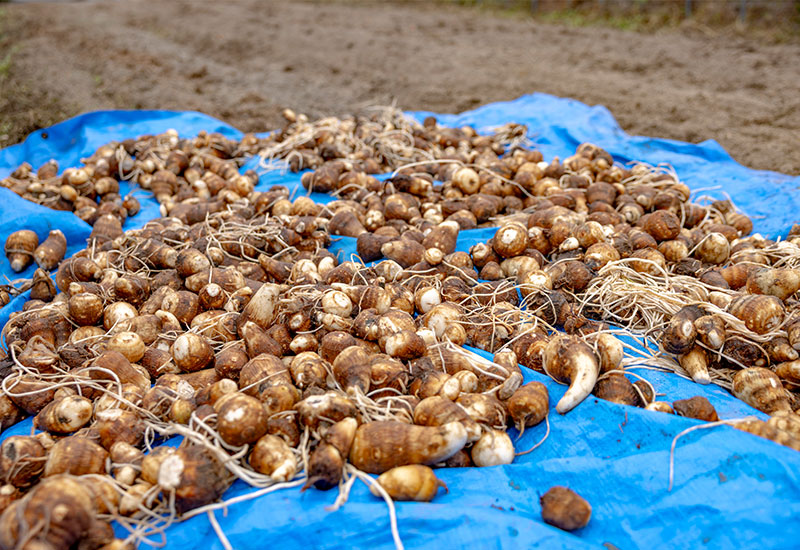 栽培している里芋は、丸型できめが細かいのが特徴です。出荷先のお客様にも好評なので、安定的な供給ができるよう、収量アップを目指しています。この辺りの圃場はもともと田んぼでしたので、里芋の栽培に適した土にするため、今年からは、近隣の牧場から購入した堆肥を散布して、土づくりに力を入れています。