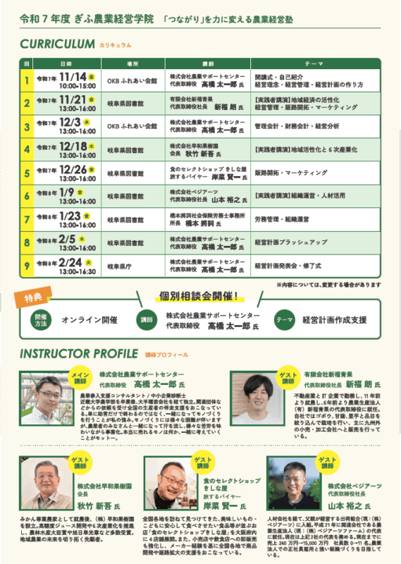 将来の岐阜県農業を支えるトップレベルの農業経営体を育成・確保することを目的に、全9回にわたってアクティブラーニング形式の講座で、自身の経営理念に基づく経営計画を作成する「ぎふ農業経営学院」を開催します。