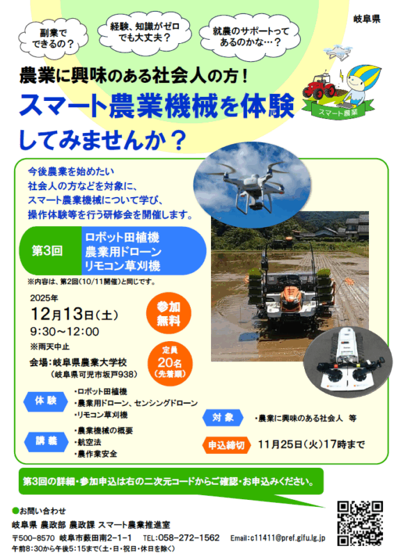 農業に興味のある社会人の方などを対象に、スマート農業機械について学び、操作体験等を行う研修会を開催します。