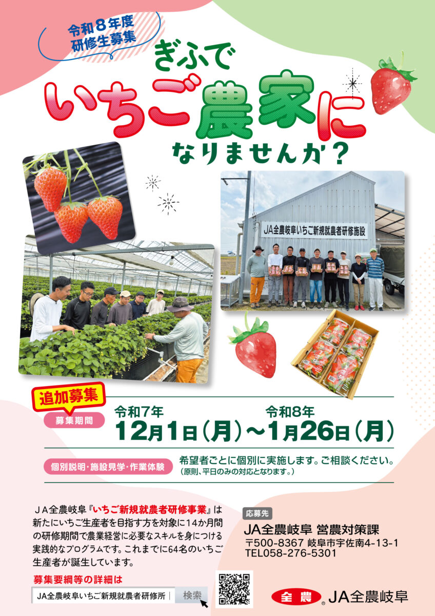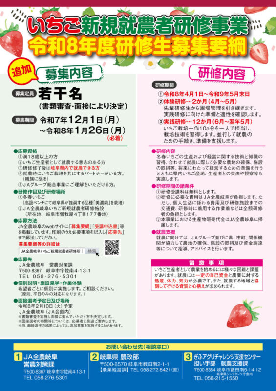 JA全農岐阜では、「いちご新規就農者研修事業」の令和8年度研修生を追加で募集しています。
