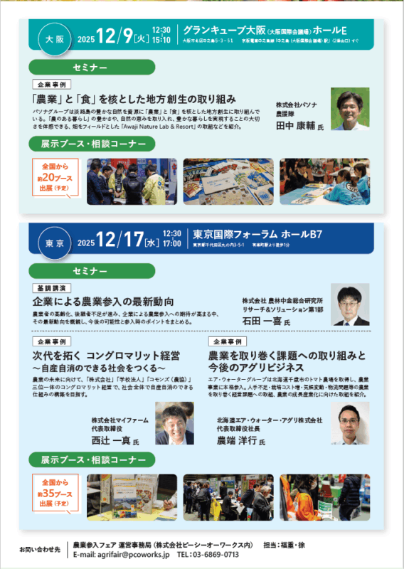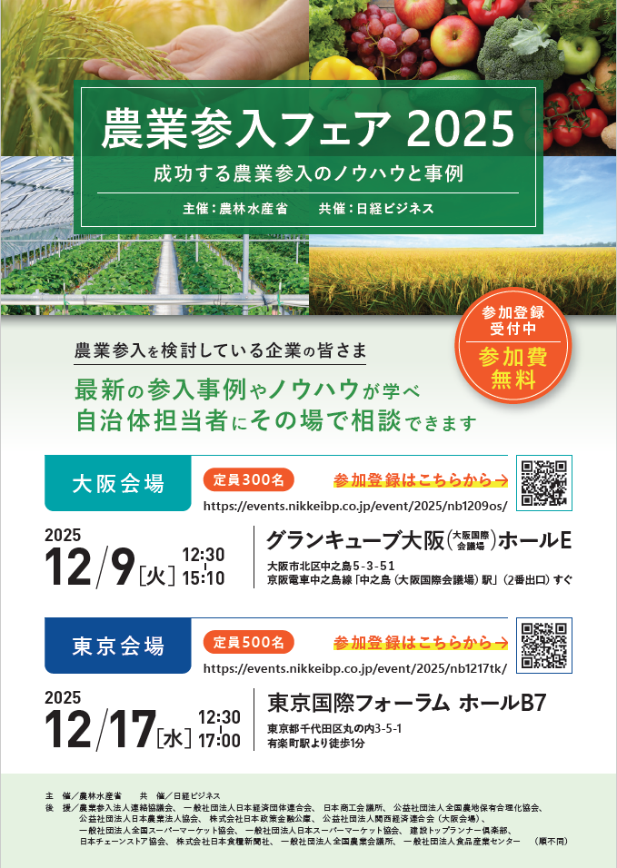 農業参入を希望する法人と法人を誘致したい地域の具体的なマッチング等を行う「農業参入フェア2025」が開催されます。