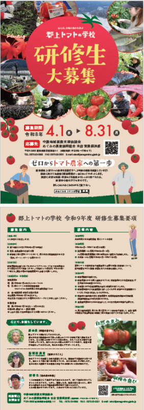 夏秋トマトの栽培技術や農業経営に必要な知識・技能を学ぶ2年間の研修を通して、独立就農を支援します。就農準備も並行しますので、農業初心者でも安心!
